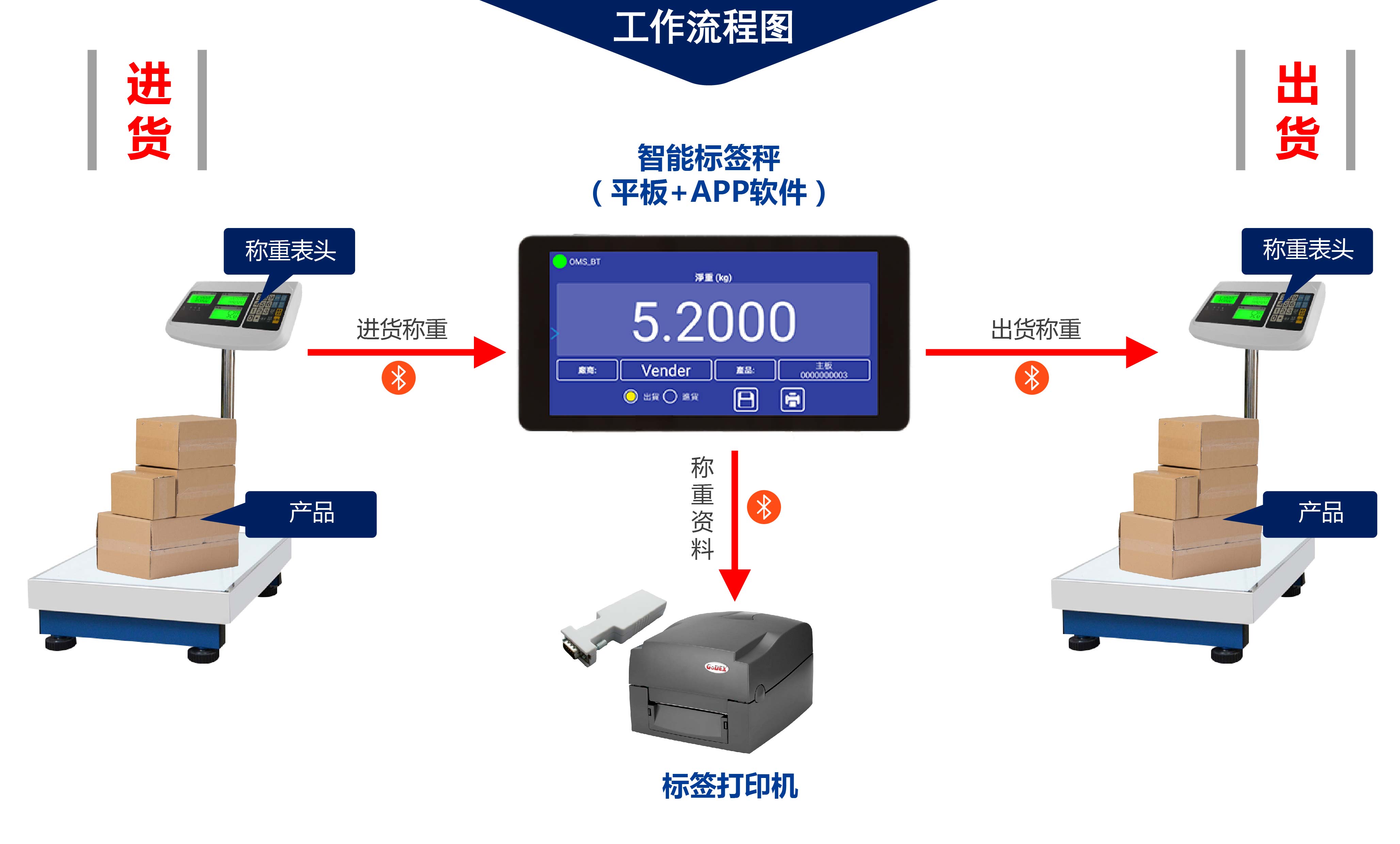 智能标签秤整合了手机/平板上的APP软件和称重表头,本着“灵活易操作”的宗旨,力求实现APP软件与称重表头的无线互动,更好的完成出货和进货,更灵活的进行标签打印。