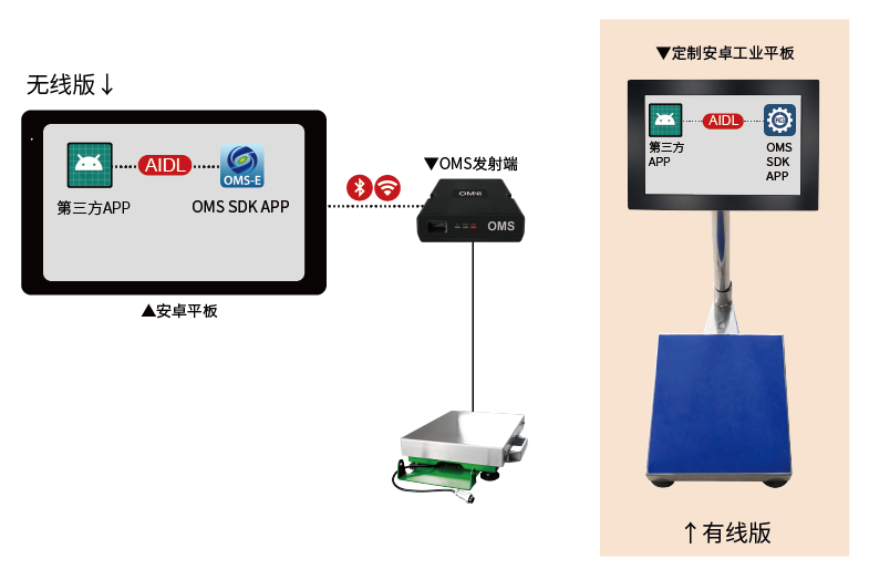 OMS SDK称重系统,采用AIDL进程间通信对接第三方APP。系统通过OMS发射端/OMS基板,整合平板/手机上的APP软件和秤台,让第三方APP实现称重功能。有线版和无线版两个版本,满足不同客户的需求,为客户节省开发时间,是一款可定制、多功能、灵活的称重系统SDK。