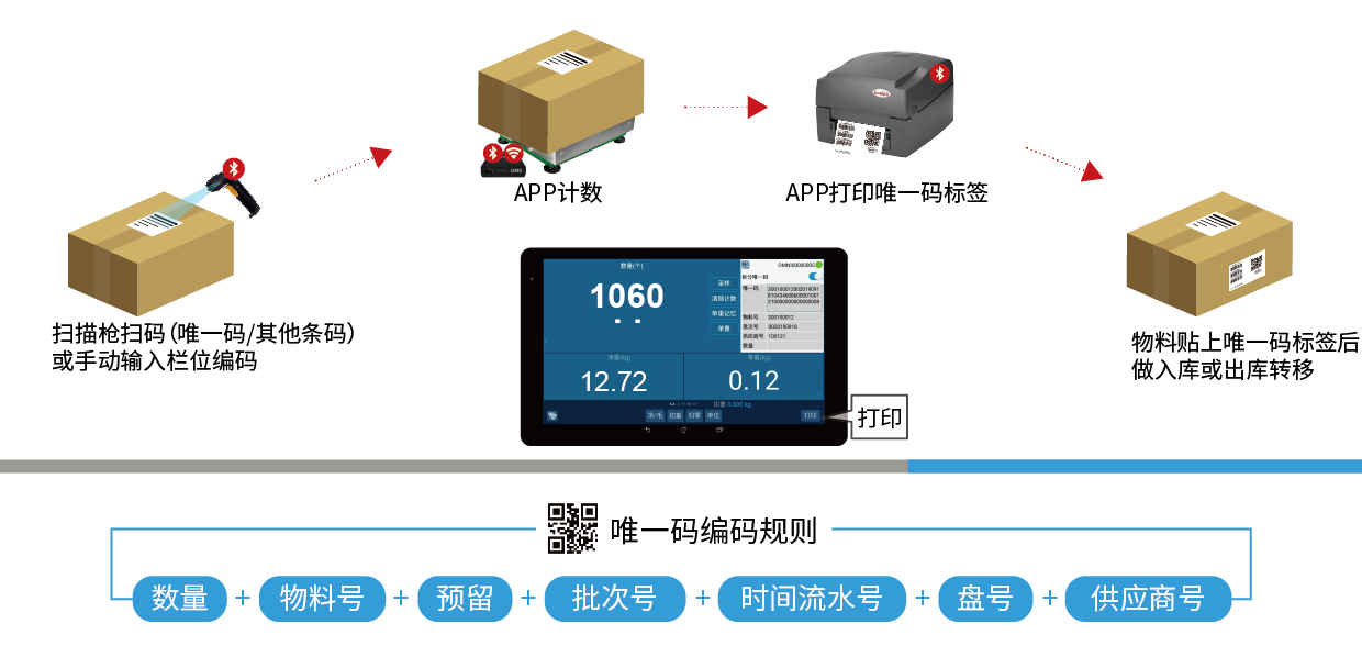 海康威视智能仓储条码管理方案,利用无线数据传输,整合OMS-E APP客制版、普通秤台、OMS发射端、打印机和扫描枪。方案设定物料在转移的过程中,通过扫码(唯一码/其他条码)或手动输入栏位(唯一码/物料号/批次号/供应商号/数量)编码后,APP产生或拆分唯一码进行计数并打印物料的唯一码标签。打印的唯一码是由数量、物料号、预留、批次号、时间流水号、盘号和供应商号组成。