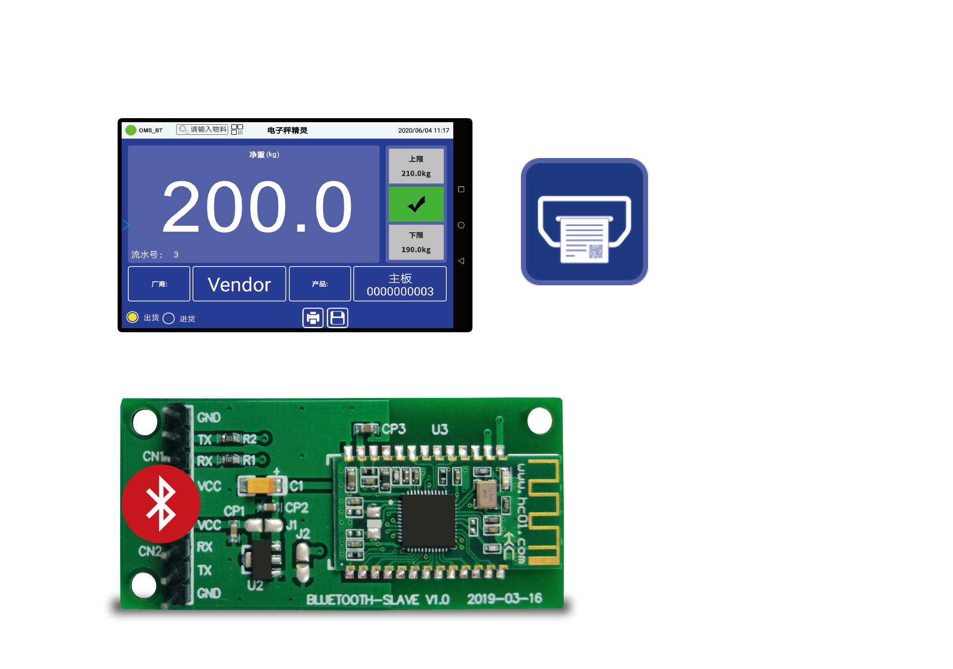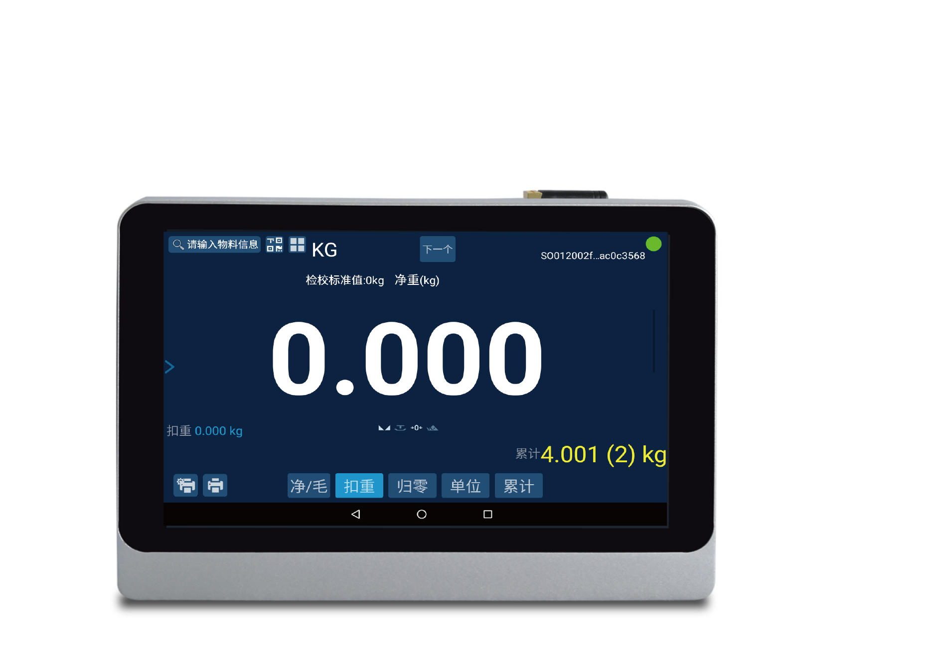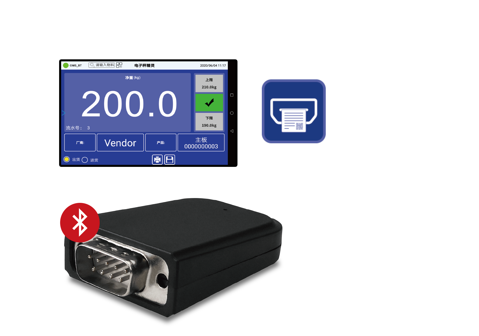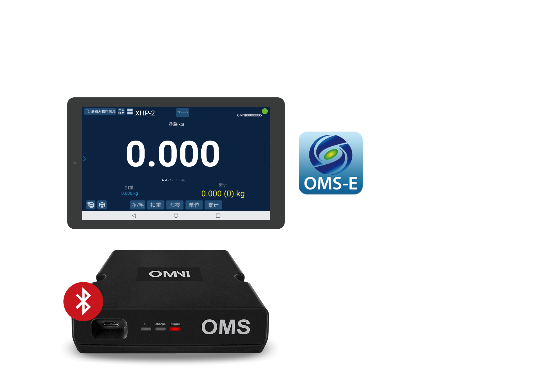 OMS智能平板秤,以OMS发射端为媒介,连接平板与称重传感器,实现远程查看称重数据。目前已实现对接ERP、标签设计打印、外接大屏显示器/摄像头/三色灯/RFID/NFC/PLC+落料设备、人脸/图像识别、语音控制、拍摄称重视频/图片等功能。