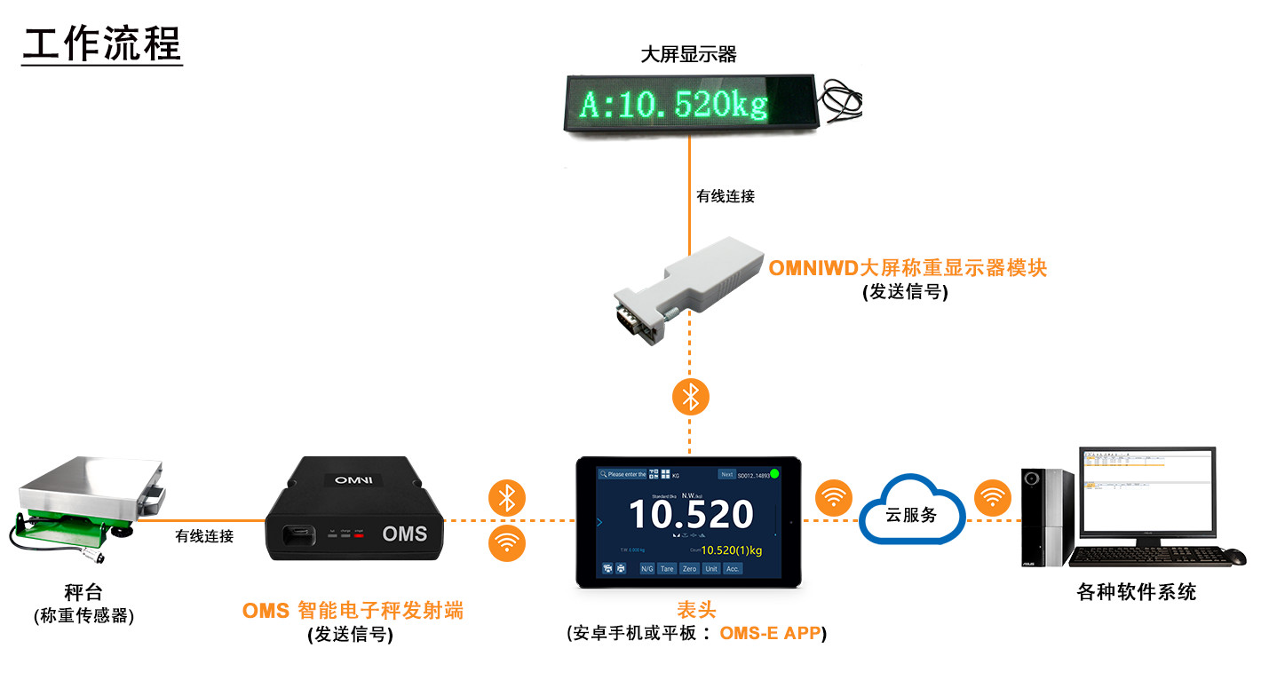 搭配OMS发射端+OMS-E APP使用,将大屏称重显示器模块OMNIWD插入显示器的RS232接口,即可实现无线显示称重重量。
