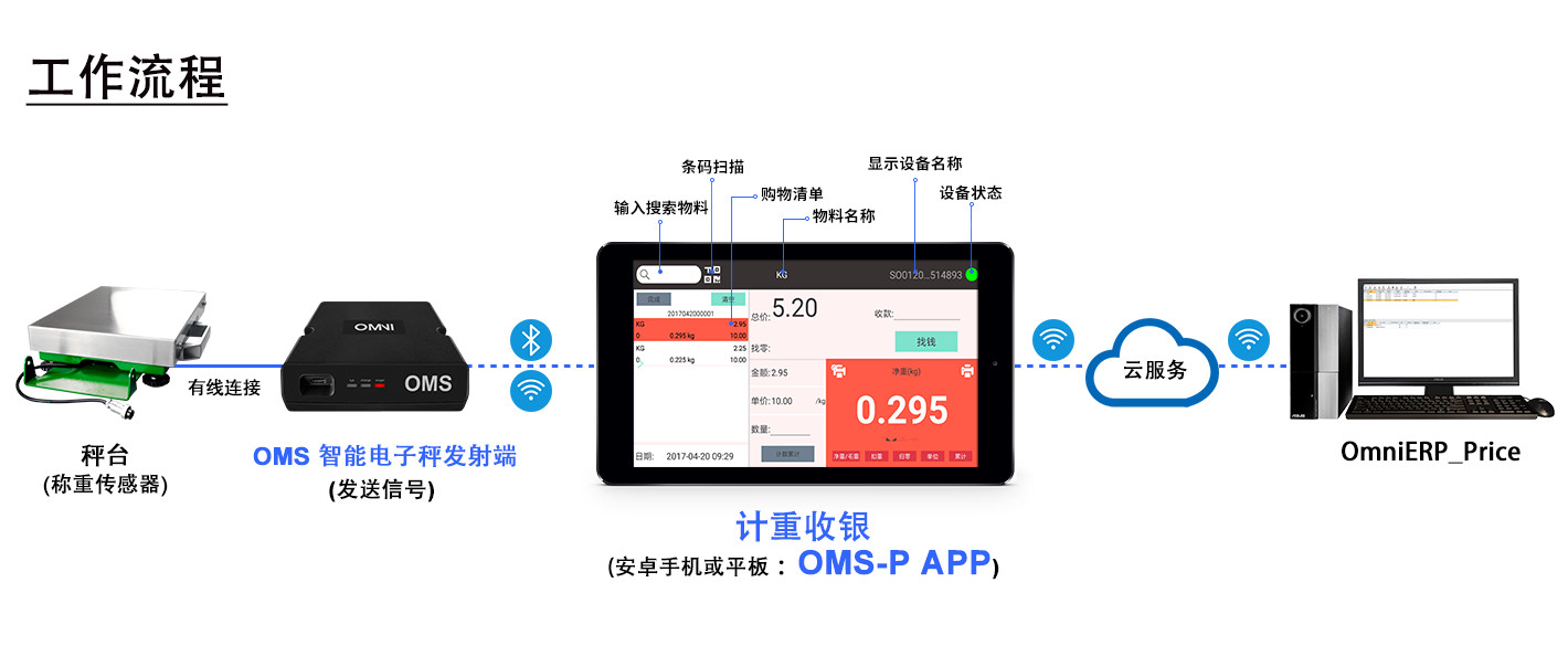 OMS-P计价秤APP,一站式收银系统,以手机、平板为媒介,快捷创建物料或者远程更新物料管理,支持计价(重量计价、数量计价)、收银、汇总累计及票据打印,方便用户管理销售额。
