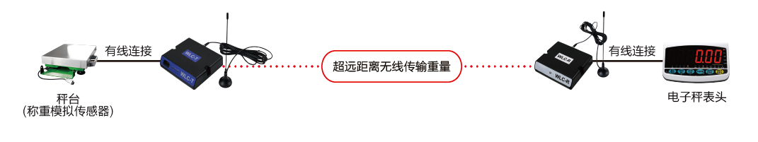 WLC-R:通过信号线连接电子秤表头,接收WLC-T发送的无线信号并显示在电子秤表头上。