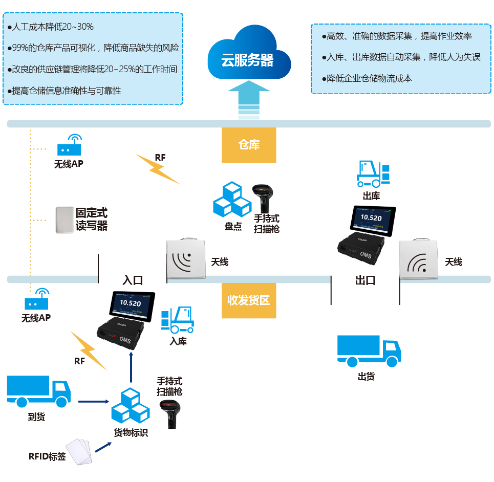 基于RFID智慧仓储应用解决方案采用:①先进的RFID技术,给货物或托盘贴上相应的电子标签,让货物与托盘相联;②托盘货物经过大门时,大门安装的天线与读写器自动读取标签,计算进出货物数量,并通过仓储系统管理软件自行核实,更新数据,实现出入库操作;③叉车装载读写器与行动装置,关联货物与货架标签,确切记录货物存放位置;④使用手持机进行盘点,通过读写标签,查询货物相关信息,也可手动输入货物名称来查找货物相应位置。