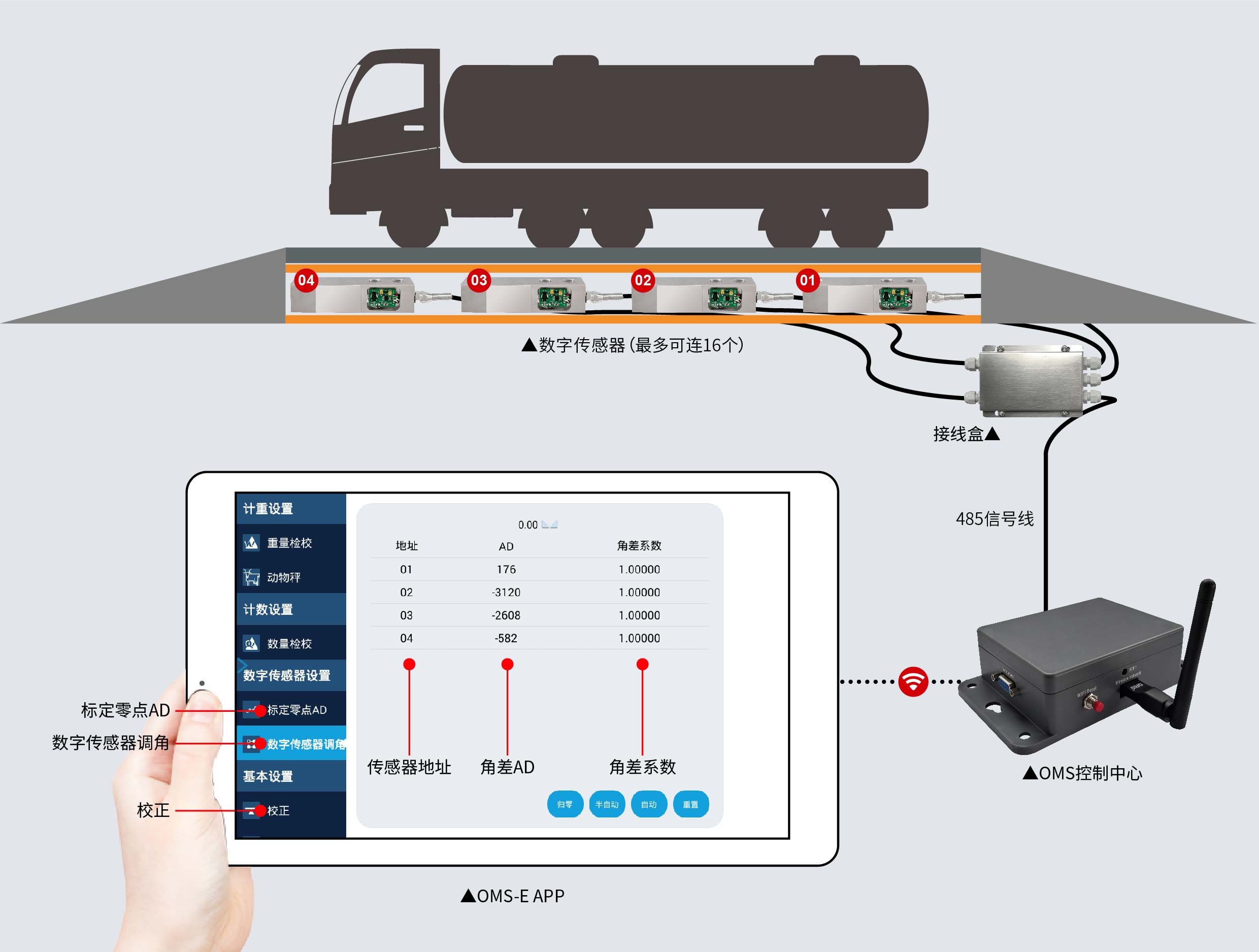 OMS数字传感器称重系统,通过OMS控制中心整合OMNI-DL-MULTI数字传感器和OMS-E APP,是一款操作简单、精准高效的称重系统。