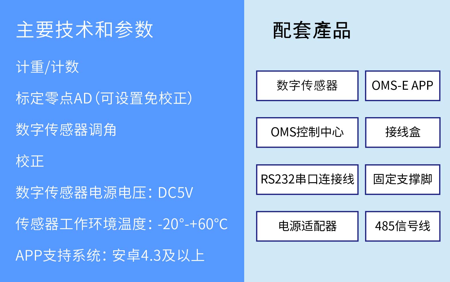 OMS数字传感器称重系统,利用无线传输技术,让OMS-E APP实现计重、计数、标定零点AD(可设置免校正)、校正和数字传感器调角等功能。APP能准确定位每一个数字传感器,解决一旦传感器出现误差必须排查所有传感器的困扰。